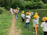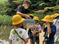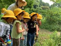 お話の後,いよいよ探検が始まりました。バッタやトンボを捕まえたり,花やいろいろな形の葉,ウシガエルの卵を見つけたりしました。また,湧き水を触ってみると「とても冷たい」と嬉しそうに教えてくれました。