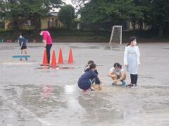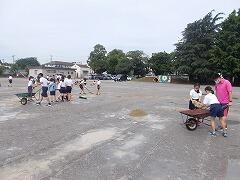「先生,お手伝いします!!」「何をすればいいですか!?」と,次から次へと集まってきました。そして,みんなで校庭の水たまりを取り除き始めました。見る見るうちに,校庭の水たまりの数が少なくなり,練習できる状態になりました。