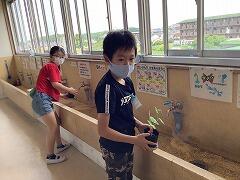 梅雨の中休みでしょうか。今日は,とても蒸し暑く感じました。午後に体育が予定されているクラスのために,高学年の人たちが昼休みから掃除の時間にかけて,校庭に水を撒いてくれました。「打ち水」をすることで,砂ぼこりが舞うのを防いだり,地熱を下げたりする効果が期待されます。特に,スプリンクラーの届かないところには,「打ち水」が効果的です。