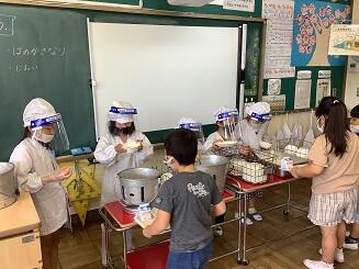 給食の準備は,どの学級も子どもたちで協力して配膳しています。