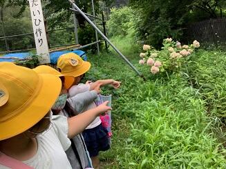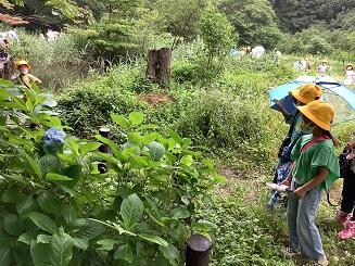 今回は,夏の自然観察です。前回と比べて,昆虫や植物に変化がないか調べました。下田の杜の方から,昆虫についての話を詳しく聞きました。ジャコウアゲハはウマノスズクサしか食べない話を聞いて,子供達は驚いていました。その草は酒井根小学校にもあるそうです。その後,虫取り網や虫眼鏡を使って詳しく調べました。秋には,どのように変化しているか楽しみです。