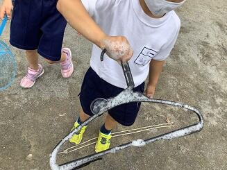 ハンガーで大きなシャボン玉をつくっています。
