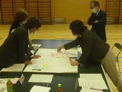 次にグループ協議。模造紙に付箋を貼りながら,意見を交わし合い,