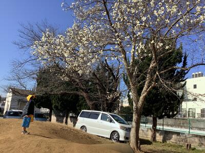 わんぱく山にはモクレン,花壇にはたくさんの花が咲いています。