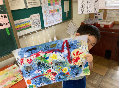 先週から,図工の学習で模様作りをしました。先週は,絵の具と洗剤を混ぜて色付きの泡を作り,画用紙に写しとりました。今週は,ペットボトルキャップを使って丸い形を写したり,できた模様を生かしてクレヨンで絵を描いたりしました。子供たちは,「おもしろい!」「シャボン玉みたい!」と楽しみながら活動に取り組んでいました。模様を生かした素敵な作品が完成しました。