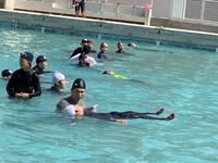 着衣泳学習は,衣服を身に着けたまま,海や川などに落ちてしまった場合に,どのように対応をすればよいのかを冷静に判断して行動できる力を身につけさせるためのものです。