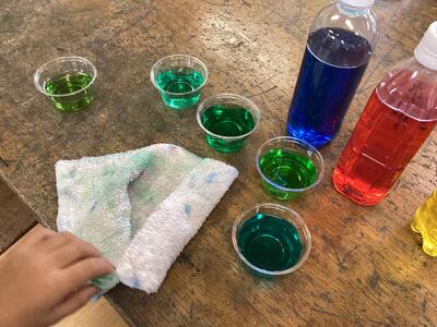 2年生は図画工作科「見つけたよ!わたしの色水」の学習で,赤・黄・青の食用色素を用いて,色水づくりを行いました。この3色の色水,「色のもと」を,水量を調節しながら混ぜ合わせることで,世界に一つだけの,わたしの色水が完成します。