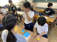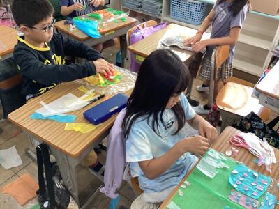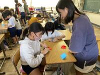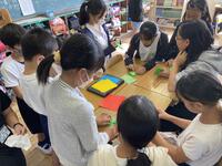 6年生からメダルの作り方を見本や動画を通して教えてもらい,説明をしっかり聞きながら,上手に折ることができました。