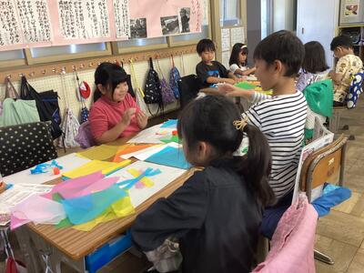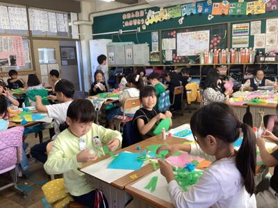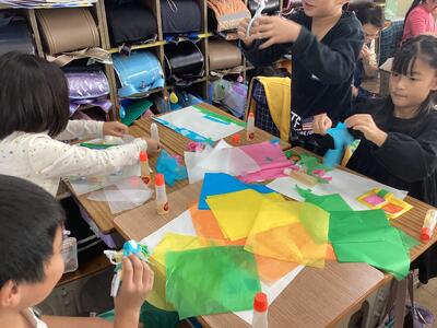 2年生は図画工作科「のりのりお花紙で」の学習で,色とりどりのお花紙を用いて,作品を作りました。お花紙を手で細くちぎったり,ハサミで切ったり,ちぎったものを重ねたり,しわをつけたり,様々な工夫をしました。