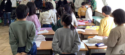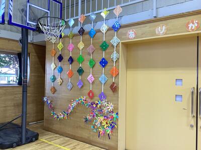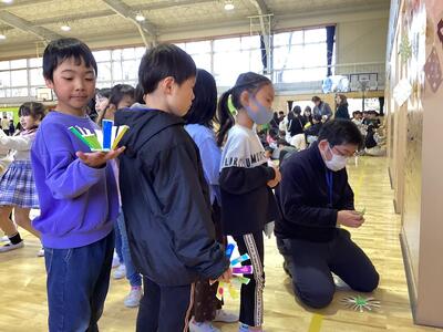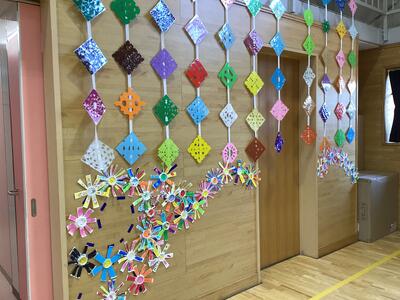 2年生は,「さよなら集会」に向けての装飾作りで,折り紙を切った雪の結晶のような飾りと紙コップでお花のような飾りを作りました。今日は4時間目に,子供たちが作った装飾を一つひとつ体育館の壁と玄関にクラスごとに貼りました。体育館に貼られた装飾を見て,「きれいだね!」「すごい!」と子供たちも嬉しそうに話していました。当日は,6年生にも喜んでもらえると良いですね。