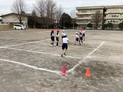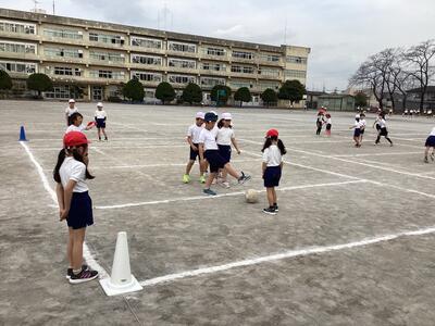 2年生の体育の学習では,ボールけりの練習を進めています。友達同士で「行くよ!」「ナイスシュート!」などと声をかけ合いながら,子供たちは楽しく取り組んでいます。今後は,少人数のチームで試合を重ねていく中で,ルールを覚え,ボールをけることに慣れていけるようにしていきたいです。