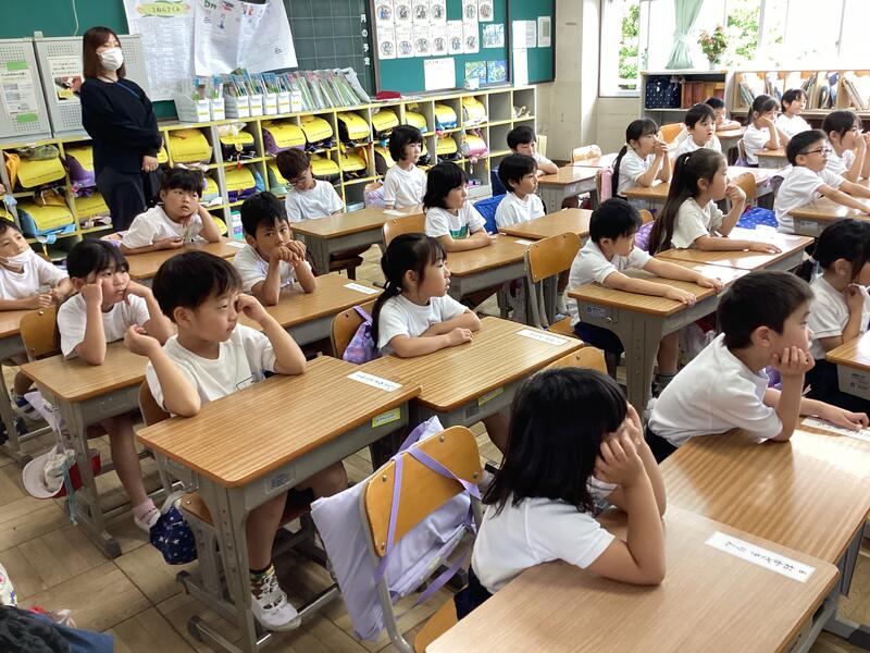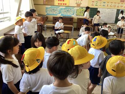 探検が終わって教室に戻ってきたとき,「校長室にはトロフィーがいっぱいあったよ」「理科室にがいこつがいたよ」「あさぎりの間に畳があったよ」「次は保健室をじっくり見たいな」「お兄さん、お姉さんの教室にも行きたいな」など,1年生はみんな嬉しそうに話していました。
