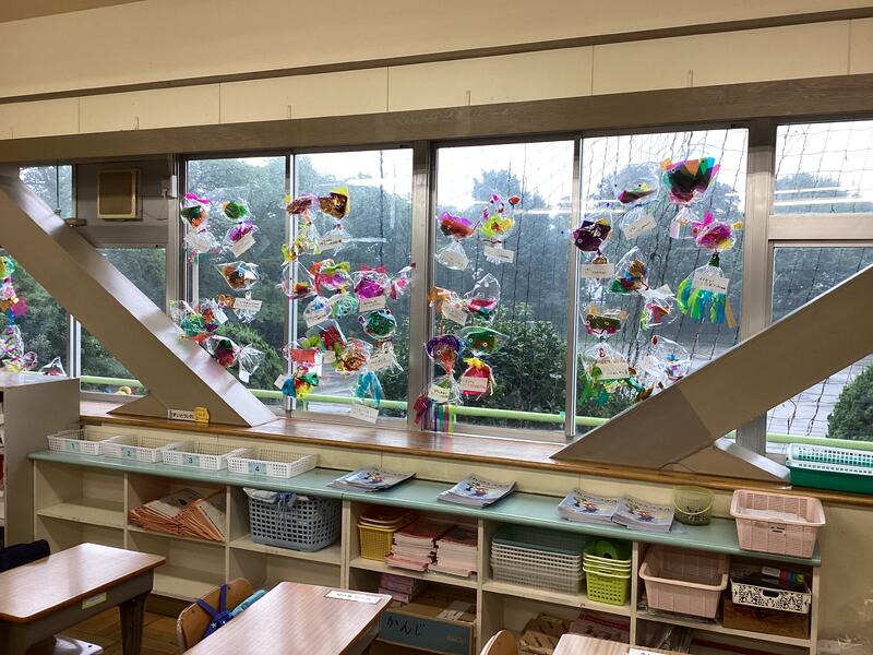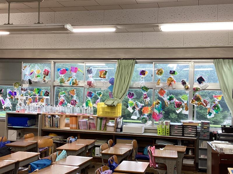 現在,作品は教室の窓際に飾ってあります。光が当たるとキラキラしていて,とてもきれいです。