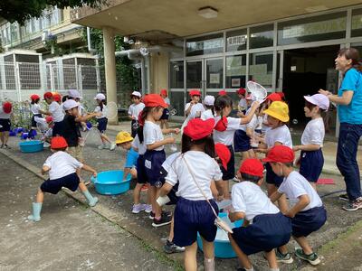「水遊び」は,アサガオの水やり用ペットボトルに水を入れて,地面に線を描いたり,木に水をかけたり,空に向かって水をまいたり…とおもいおもいの方法で楽しんでいました。