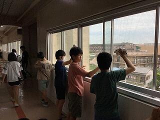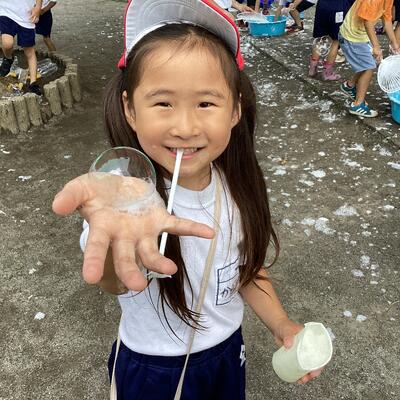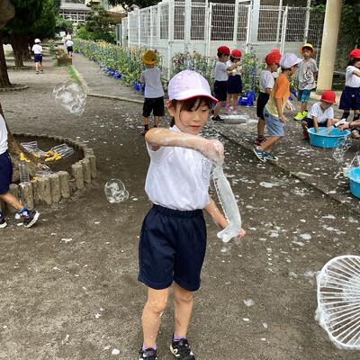 「シャボン玉遊び」は,中性洗剤,洗濯のり,水を混ぜてシャボン液を作りました。それを紙コップに入れ,ストローの先につけて「ふうっ」とふくと,丸いシャボン玉がふんわりと空へ飛んでいきました。また,シャボン液を大きなたらいに入れ,うちわの枠につけて,そうっと枠を横に振ると,たくさんのシャボン玉が空に飛んでいきました。今日は少し風が吹いていたので,校舎の4階の方まで高く高く飛んでいきました。とてもきれいでした。