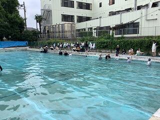 着衣泳では,着衣のまま泳ぐ,浮く感覚を知ることと,水難事故の際の対応方法について,学習しました。