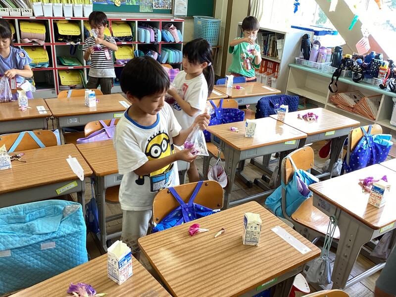 「なつとなかよし」の学習では,アサガオの色水作り,水遊び,シャボン玉遊びを行いました。夏休みの間に,ご家庭でもお試しいただけたらと思います。
