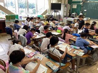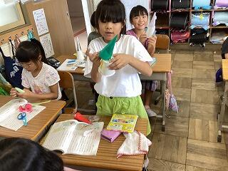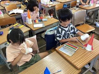 2年生は今週,ジャンプロケットを制作しました。教科書の説明をみんなで確認し,のりやはさみ等の道具を上手に使いながら自分だけのオリジナルロケットを作ることができました。「より遠くに飛ばす工夫はないかな・・・」「他になにかできる工夫はないかな」等授業の後半には,自分なりの工夫を考える子供たちもいました。2学期には1年生に「おもちゃパーク」を開く予定です。今回のおもちゃ作りの経験を生かしていければ良いなと思います。