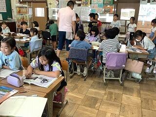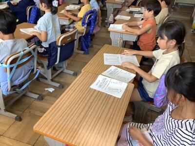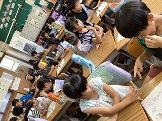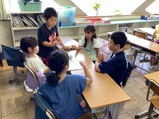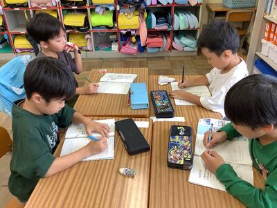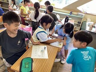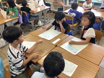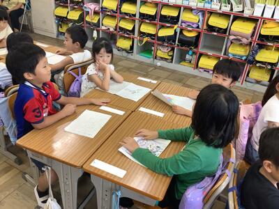 国語では「なつのおもいでをはなそう」という学習で,夏休みに行った場所やしたことなどについて,班で発表しました。発表した後は,質問をしたり,感想を伝えたりしました。「ぼくも同じところに行った」「私もやりたいな」など,盛り上がっていました。