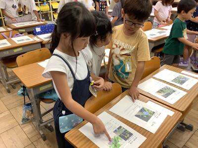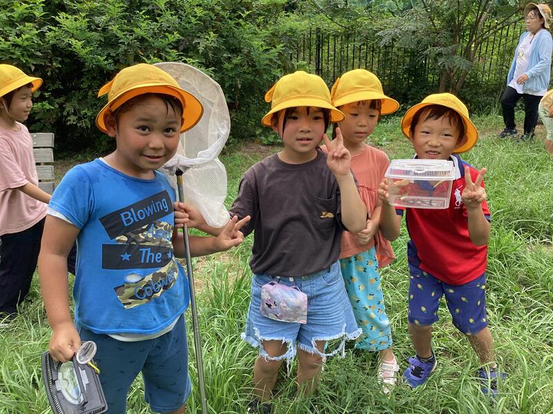 下田の杜に着いてからは,班で虫探しをしました。班の友達と協力して虫取りをする姿が見られました。トンボやバッタ,コオロギやチョウなど学校ではなかなか見つからない虫もたくさん見つかって子どもたちも興味津々でした。