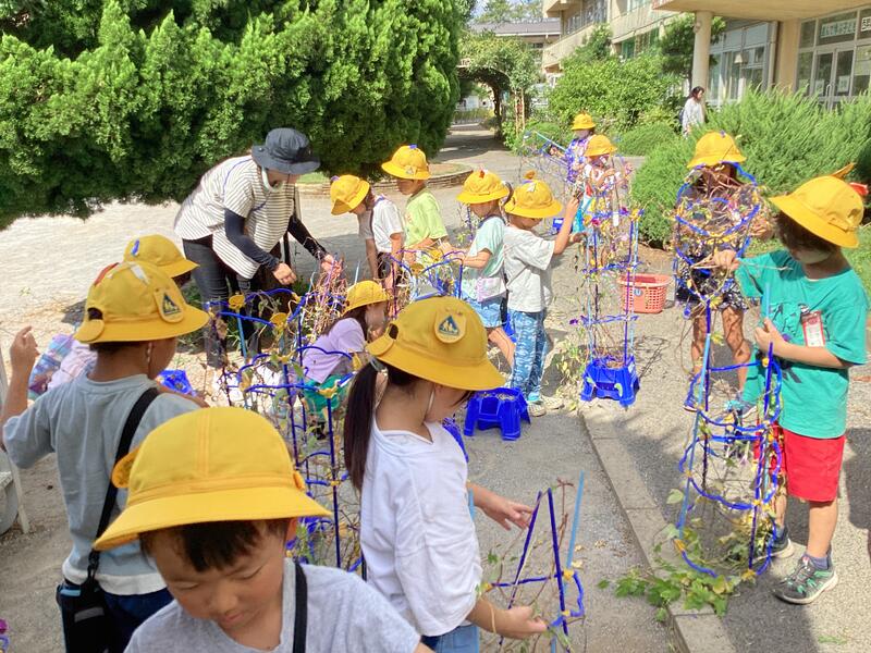 支柱に絡まったツルを取るのに子どもたちは一苦労でした。