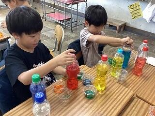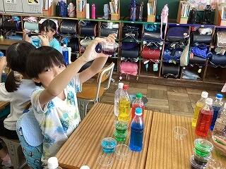 2年生は,「見つけたよ、わたしの色水」を学習しました。赤・青・黄・透明の色水を自分の持ってきたペットボトルに入れて自分のオリジナル色水を作りました。色水を混ぜた時,濃い紫になったり,薄い紫になったり色水を入れる量によって違う色になることを子供たちは楽しみ,お気に入りの色を5個決め家に持って帰りました。子供の中には「家でも作ってみる!」などの声が上がっていました。色々な色を混ぜて色を作る楽しさをもっと知ってもらえれば良いなと思います。