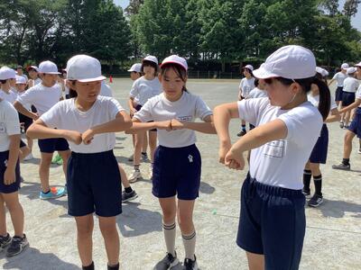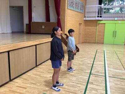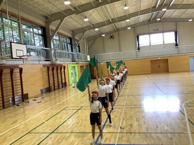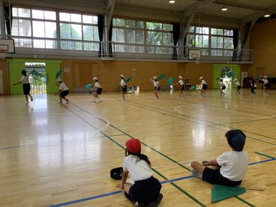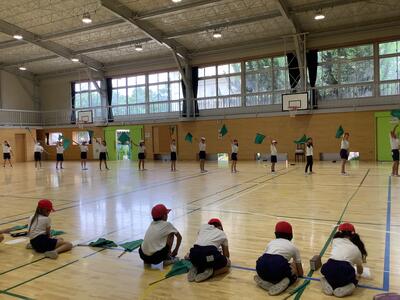 体育では、「フラッグの演技」のテストをしました。皆、緊張感をもって一生懸命に踊ることができました。また、友達の演技を見て、よいところをたくさん見つけることができました。練習中は、お互いの演技を見る機会がなかったので、体育の学習中に友達の演技を見たことは、子供たちにとって新鮮だったようです。