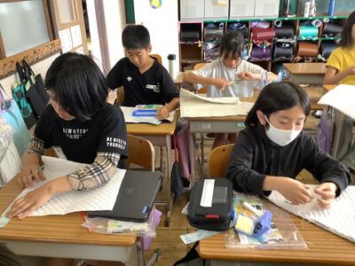 久しぶりに針と糸を使う子もいて、ちょっとドキドキしている様子もありますが「早く完成させて修学旅行にもっていきたいな!」「私が作ったバックをお姉ちゃんにプレゼントするのが楽しみ!」とやる気いっぱいでがんばっています。