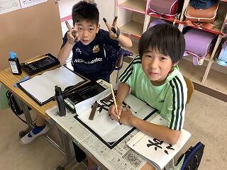 今週の授業では、「二」という文字を書きました。横棒を2本書けばよいのではなく、最後にぴたっと筆を止めることでより美しい文字を書けると教えてもらい、一生懸命に練習をしました。来週はどんな文字に挑戦し、どんな作品が出来上がるのか楽しみです。
