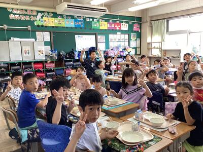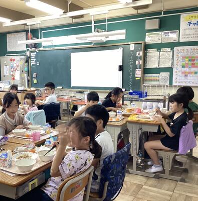 「先生たちは小学生の頃,こんな風に班でたべていたんだよ!」と伝えると「えー!」ととても驚いていました。