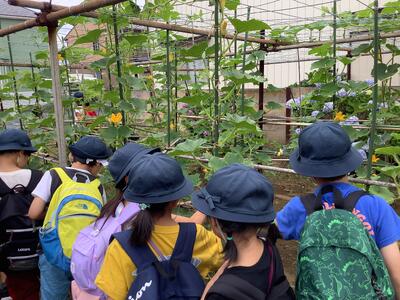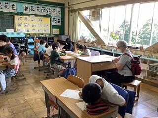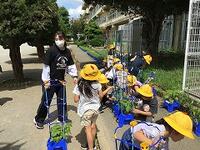 5月に種をまいたアサガオが大きくなってきました。今週は,各クラスで間引きをしたり,支柱を立てたりする予定です。子供たちは,毎日の水やりをがんばっています。観察を行うと,「触ると葉がフワフワしている。」「早く綺麗な花が咲くのが見たいな。」と口々に話していました。
