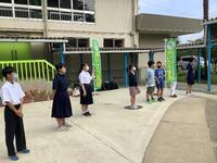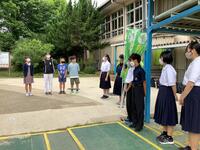 6月20日(月)の朝,サカスクの取り組みで,あいさつ運動が行われました。この取り組みは昨年度から始まっており,小中学校が連携して行っています。この日は,酒井根小学校の児童会と,酒井根中学校の生活委員会の生徒が来校して活動を行いました。