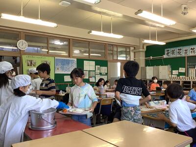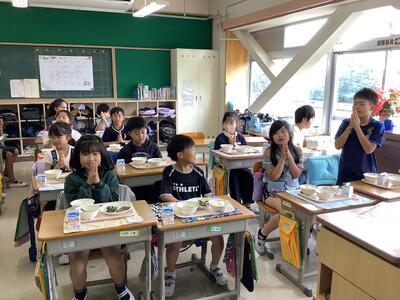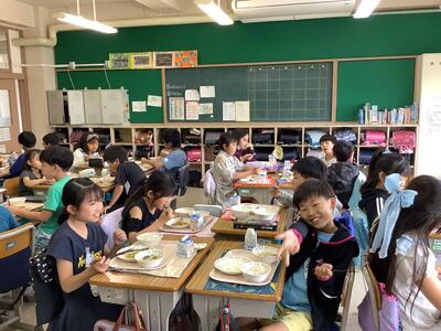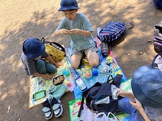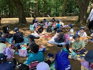 日が強くなってきたためお弁当は,木陰で食べました。様々なおかずが入ったお弁当を見て子供たちは嬉しそうに食べていました。持ってきたお菓子を見せ合っている姿も見られました。