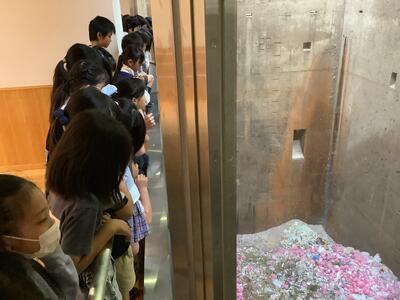 先週の木・金曜日には,南部クリーンセンターに行きました。ゴミピットの深さや,巨大なゴミクレーンをみて,「こんなに大きいの?」と驚きの声が上がっていました。3Dシアターでは,可燃ごみの行方をごみ目線で体験しました。ごみ収集車から降ろされたごみが,燃やされて煙になるまでを視聴しました。