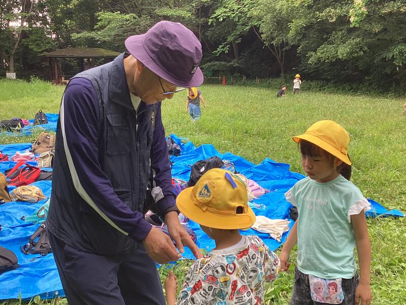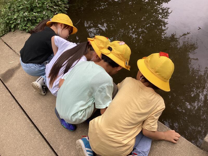 スタッフの方が下田の杜にある生物や植物の紹介をしてくれました。そのあと各自で下田の杜を探検しました。「大きなオタマジャクシを見つけたよ」「小さなバッタの赤ちゃんがいるよ」「草相撲で勝てたよ」など聞こえました。