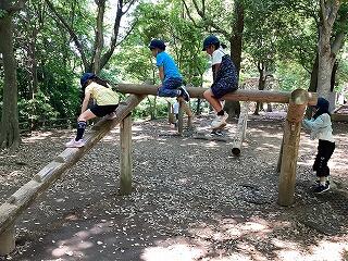 お昼の後アスレチックで遊ぶ時間がありました。各々のグループで決めた順番で遊びに向かい,ボール島やじゅえむタワーなどで楽しそうに活動する姿が見られました。