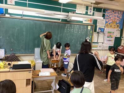 キャンドルづくりでは,5色+黒色のろうを使いオリジナルキャンドルを作りました。手の温かさで柔らかくなったろうを上手にこねてくっつけることができました。完成したキャンドルを見て子供たちはとても嬉しそうにしていました。