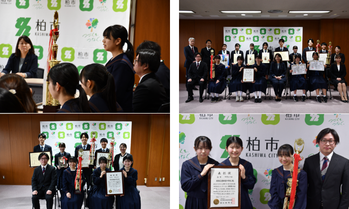 令和8年3月17日(火)、第73回全日本吹奏楽コンクールで見事金賞・朝日新聞社賞に輝いた吹奏楽部が、柏市長を表敬訪問いたしました。日頃の練習の成果や支えてくれた周囲への感謝を自分の言葉でしっかりと伝えました。柏市長からは温かい激励のお言葉をいただきました。今回の経験を糧に、次なる目標に向かってさらに邁進してまいります。応援ありがとうございました。