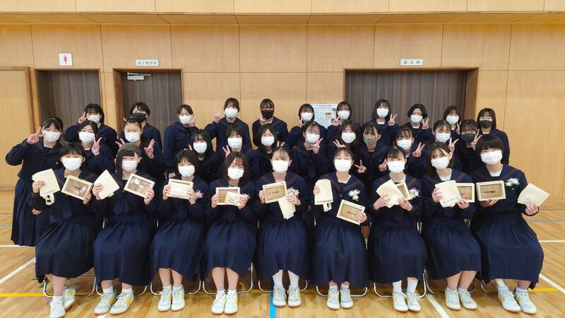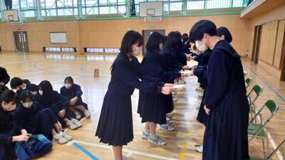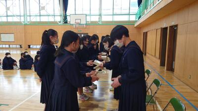 例年のような卒業試合はできませんでしたが、放課後に集まり、1・2年生からお祝いの言葉とプレゼントがありました。