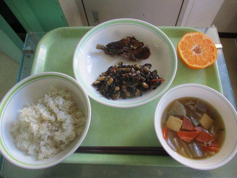 牛乳 白飯 鰯の蒲焼き 大豆の磯煮 田舎汁 ポンカン