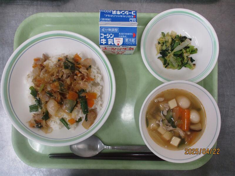 一覧へ プルコギ丼 日時 2025年04月22日(火) 公開対象 給食献立 詳細 牛乳 プルコギ丼 きくらげ中華和え 豆腐の四川風スープ 作成者 酒井根中学校 更新日時 2025-04-22 12:06:01
