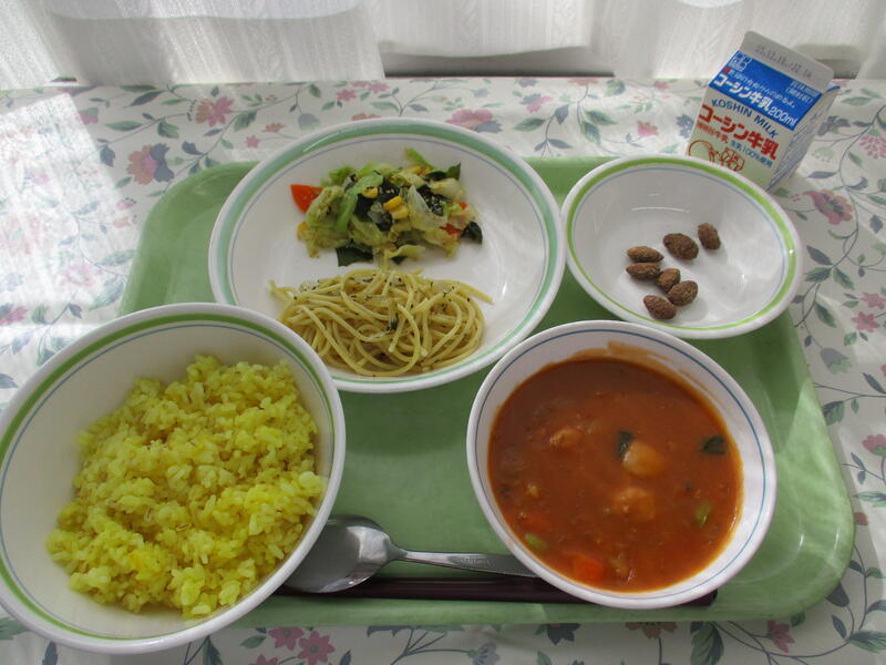 一覧へ サフランライス・米粉のポークシチュー・バジリコスパゲティ・わかめとコーンのサラダ・黒糖アーモンド・牛乳 日時 2023年12月07日(木) 公開対象 給食献立 詳細 作成者 酒井根中学校 更新日時 2023-12-07 13:36:59