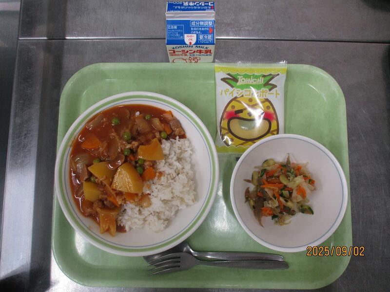 一覧へ ハヤシライス 日時 2025年09月02日(火) 公開対象 給食献立 詳細 牛乳 ハヤシライス ごぼうと青大豆のサラダ 冷凍パイン 作成者 酒井根中学校 更新日時 2025-09-02 12:13:02
