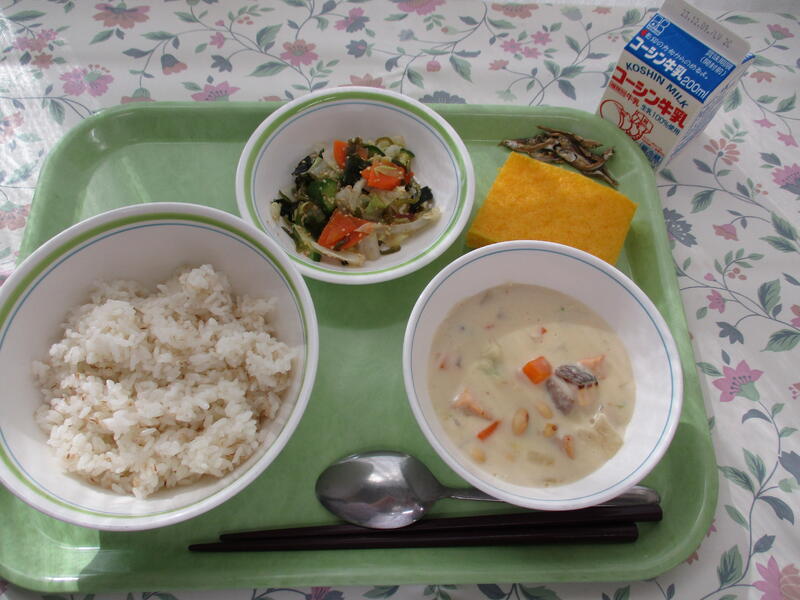 一覧へ ごはん・鮭と花野菜のシチュー・海そうサラダ・キャロットケーキ・小魚・牛乳 日時 2023年11月28日(火) 公開対象 給食献立 詳細 作成者 酒井根中学校 更新日時 2023-11-29 12:40:31