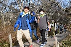 紅葉する日光男体山をバックに約5kmの道のりをハイキングしました。途中疲れが見え始めたころ,児童同士,「がんばろう!」。危ない場所を見つけたら,「ここ危ないよ」。すれ違ったハイキング中の方に「こんにちは」。その時,その場所にあった声かけをするGOODな姿が多く見られました。ゴール地点の湯滝の迫力は圧巻でした。