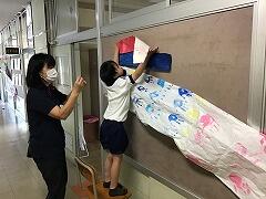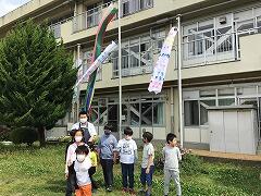 障子紙に手形で鱗をつけ,個性的な鯉が3匹,東小の空を泳ぎました。