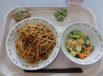今日の給食は「牛乳,スパゲティナポリタン,マセドアンサラダ,ごまたっぷりスコーン,そら豆」です。