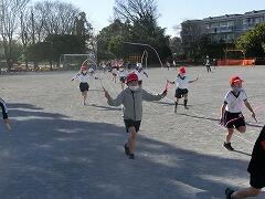 全学年で取り組んでいるのは縄跳びです。短縄跳びでは一人一人目当てを決めて色々な技に挑戦したり、縄跳び検定合格を目指したりしています。