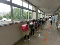 適度な距離をとり,並ぶことができています。写真は1年生の様子です。学校再開から2週間が経ち,自分たちで並ぶことができるようになってきました。