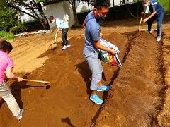 肥料等を混ぜながら,畑の畝作りを行いました。